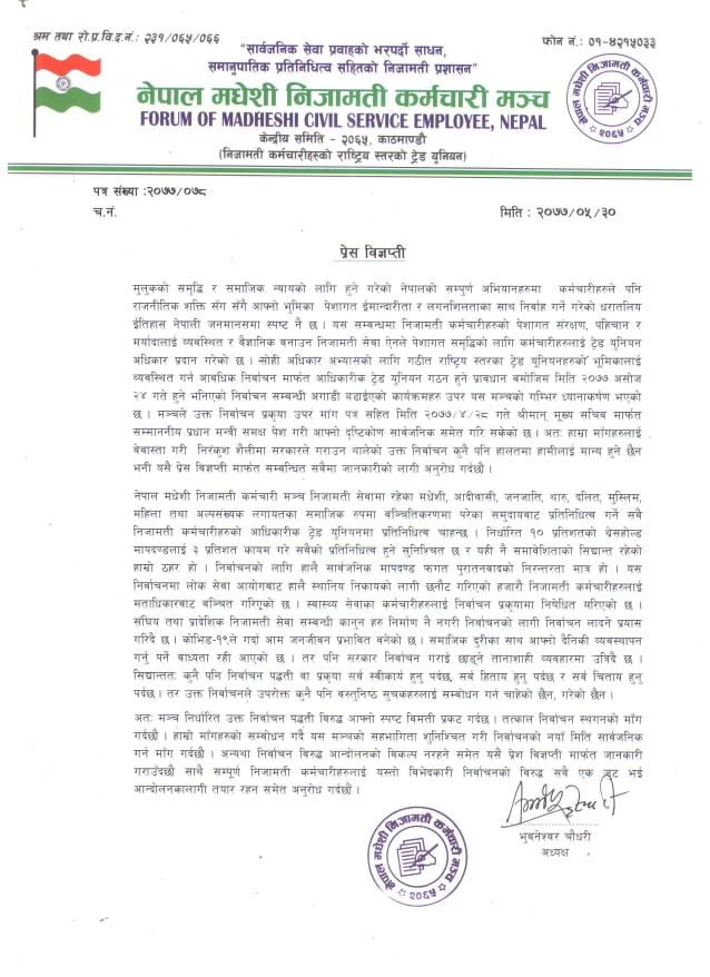मञ्चले मंगलवार एक विज्ञप्ति जारी गरी आफूहरुले मुख्यसचिव मार्फत प्रधानमन्त्रीलाई मांग बारे जानकारी गराएपनि त्यसलाई बेवास्ता गरी निरंकुशशैलीमा निर्वाचन गराउन लागेकोले हामीलाई मान्य नहुने भन्दै तत्काल स्थगित गर्न मांग गरेको छ ।