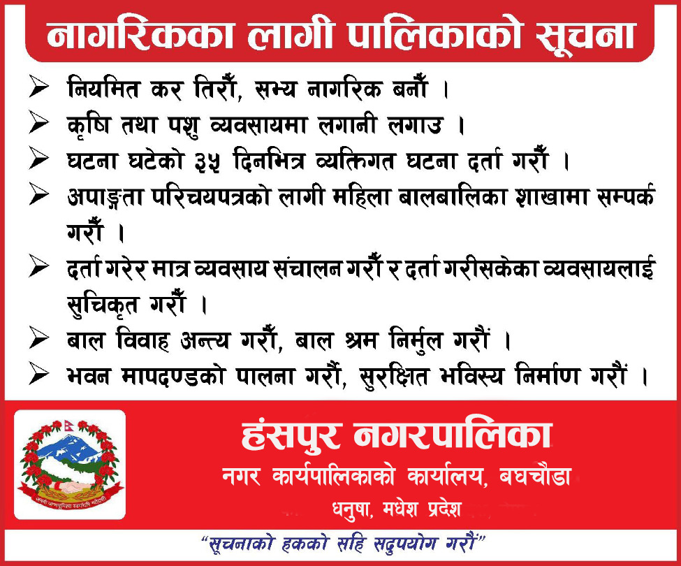 विज्ञापनका लागि सम्पर्क नं.: